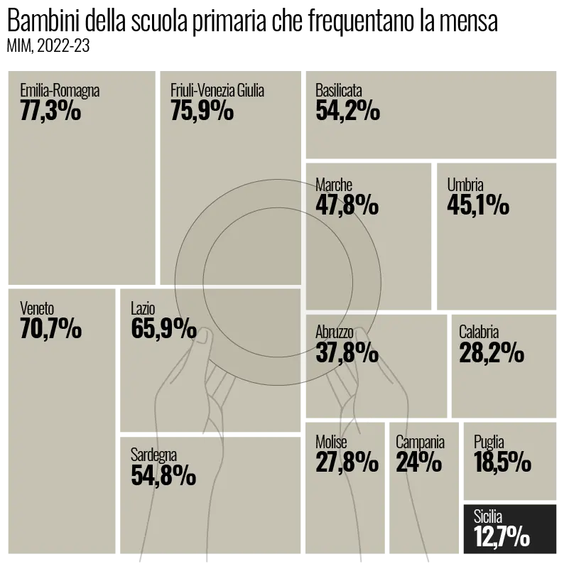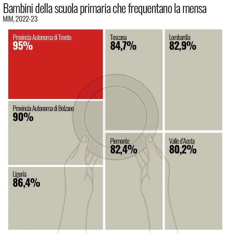 E la percentuale di bambini della scuola primaria che frequentano la mensa, che mostra valori inferiori al