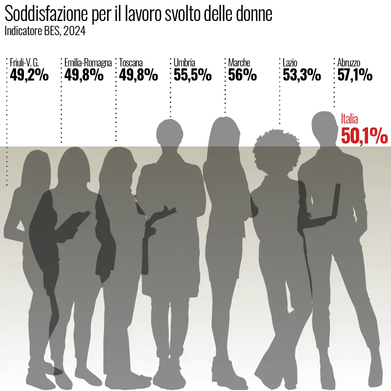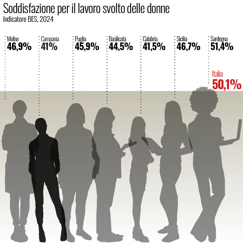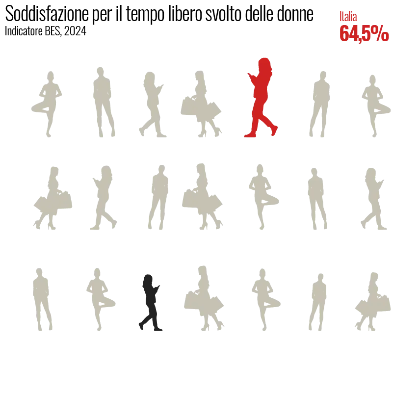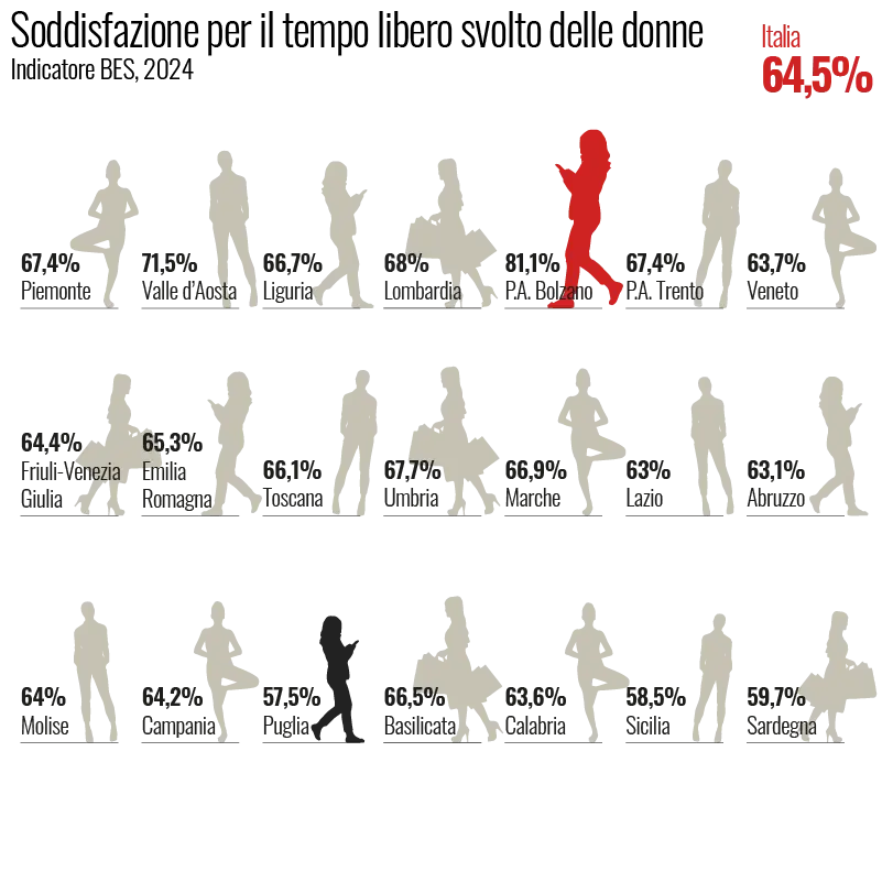 E la soddisfazione delle donne per il tempo libero, che mostra i valori più bassi in Puglia (57,5%) e Sicilia