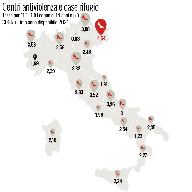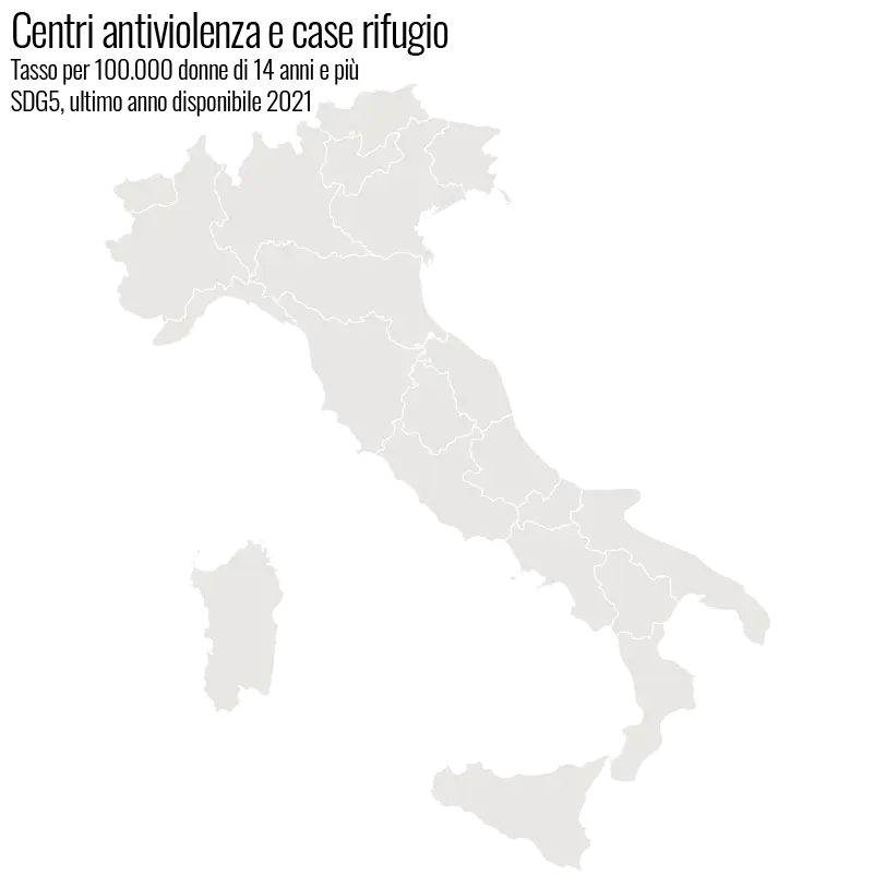 Infine, per il dominio Violenza l’indicatore usato è il tasso di centri antiviolenza e case rifugio (per