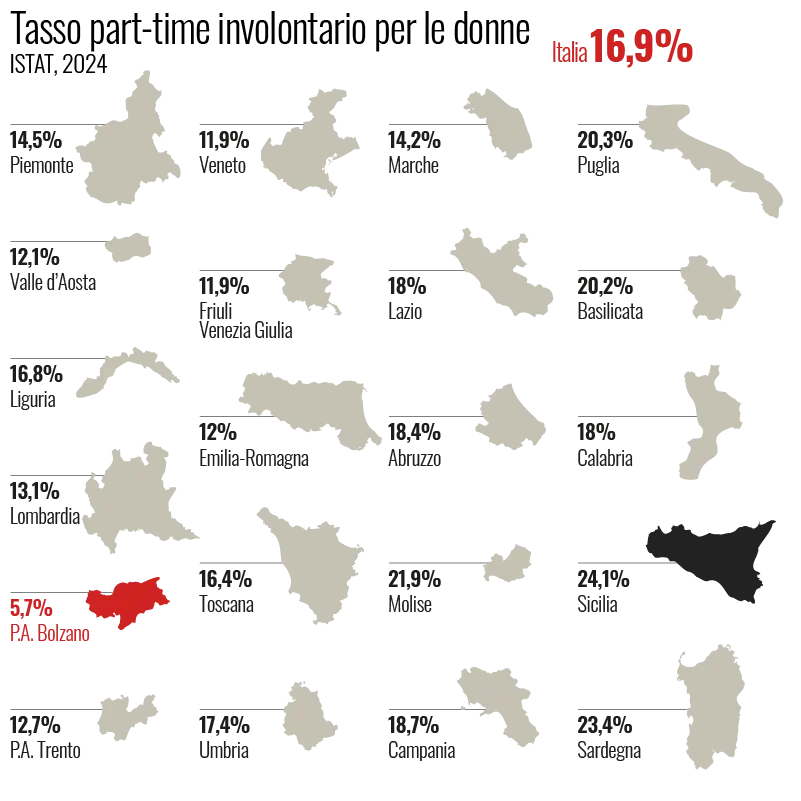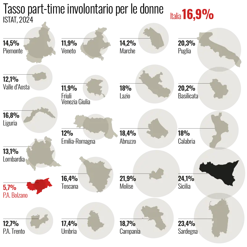 Il tasso di part-time involontario per le donne è inferiore al 10% solo nella Provincia autonoma di