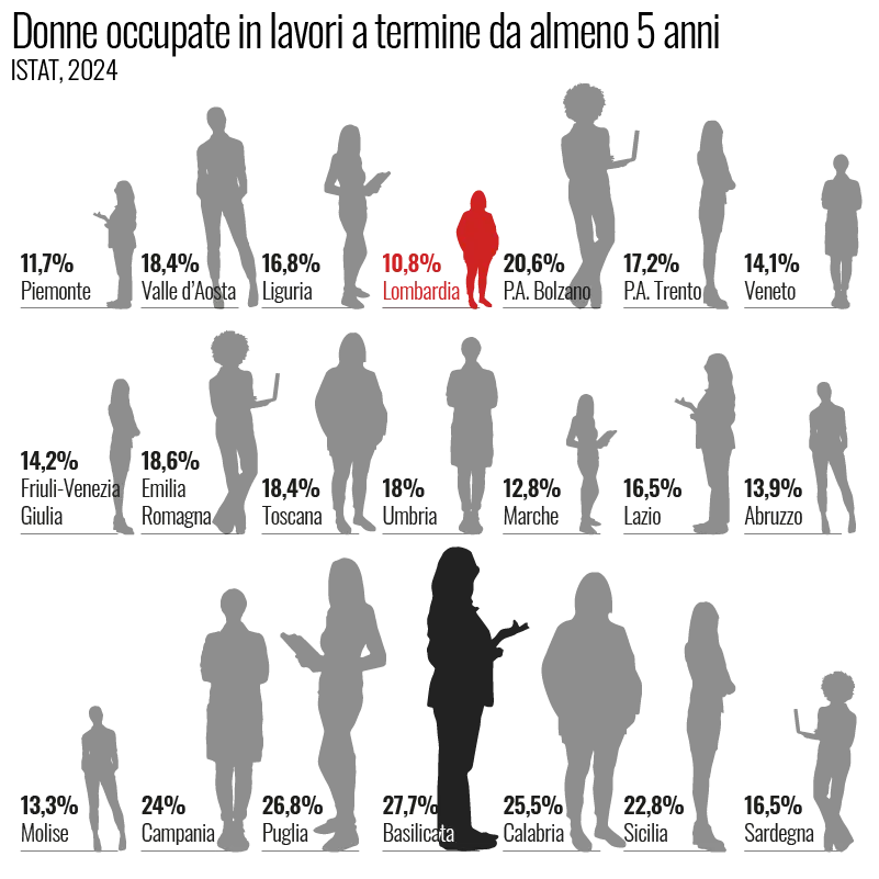 La percentuale di donne occupate in lavori a termine da almeno 5 anni supera il 25% in 3 regioni del