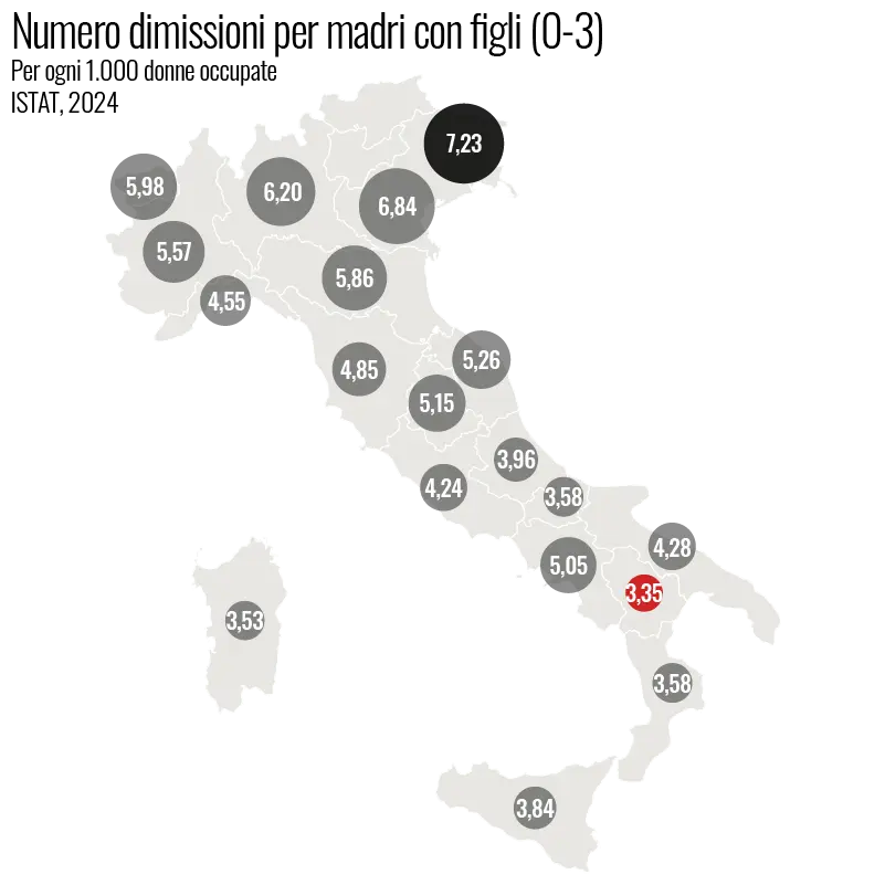 Il numero di dimissioni per le madri con figli 0-3 anni ogni 1.000 donne occupate è invece più alto nelle
