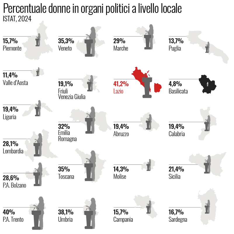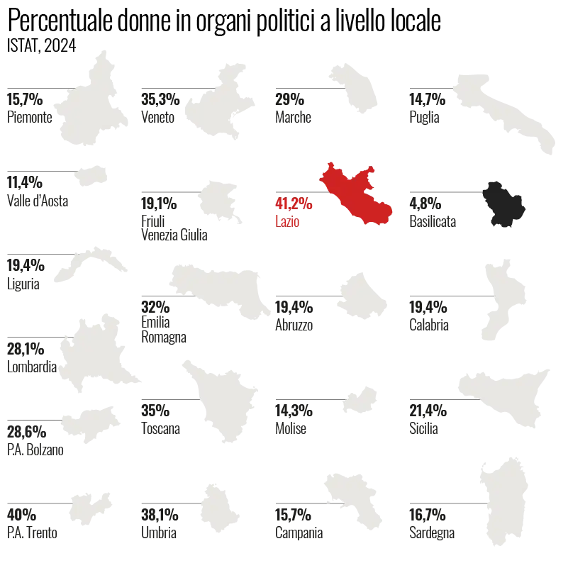 locale per regione. Il valore più basso si registra in Basilicata, dove le donne in organi politici a livello