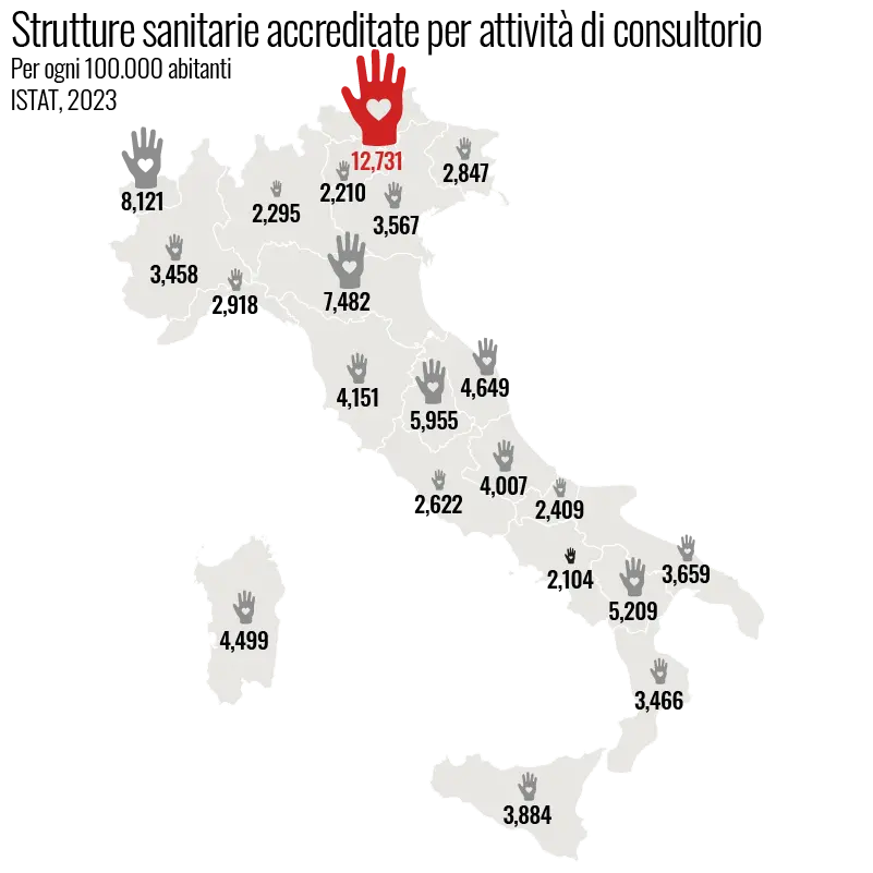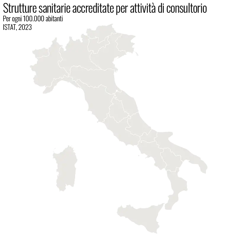 E le strutture sanitarie accreditate per attività di consultorio (ogni 100mila abitanti), che mostra i valori