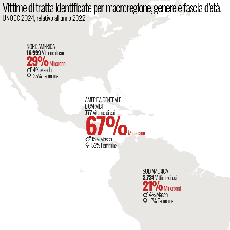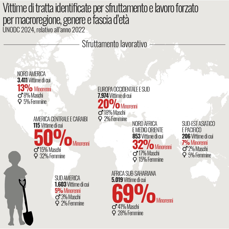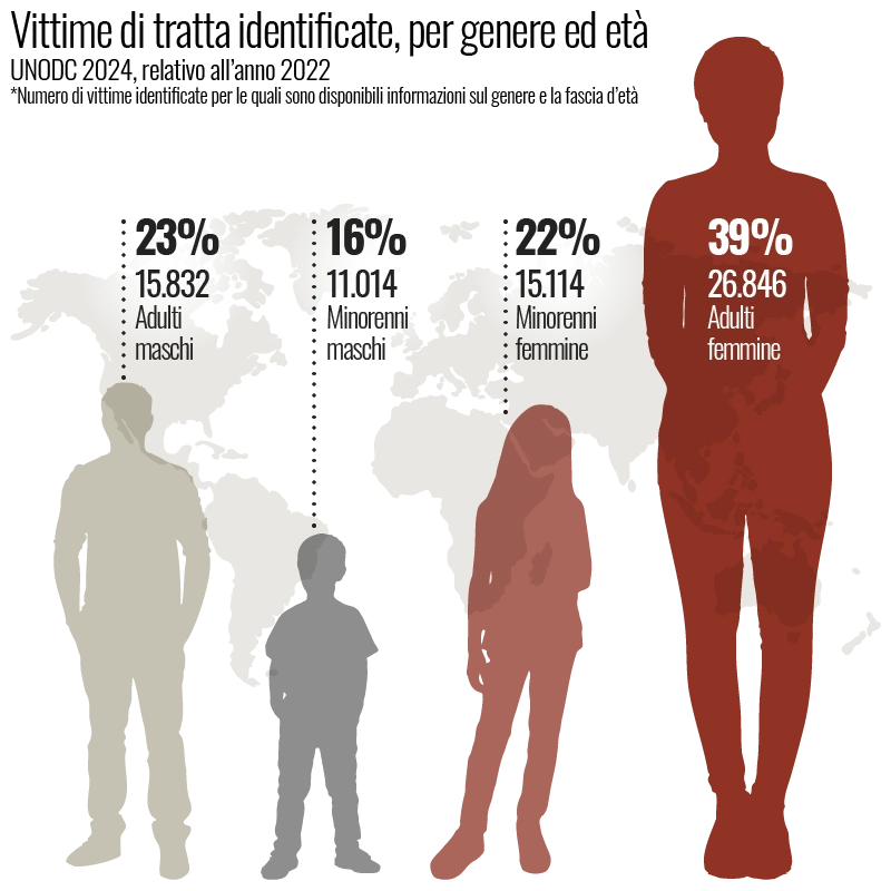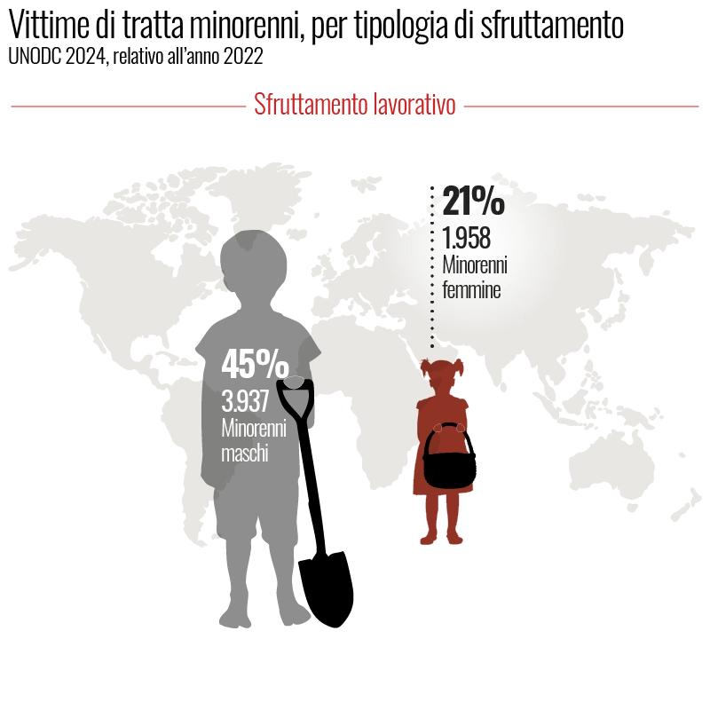 Le ragazze rappresentano il 57% delle vittime minorenni rilevate a livello globale, con il 60% dei casi riconducibile a forme di sfruttamento sessuale. I ragazzi, al contrario, risultano maggiormente coinvolti in situazioni di lavoro forzato (45%)