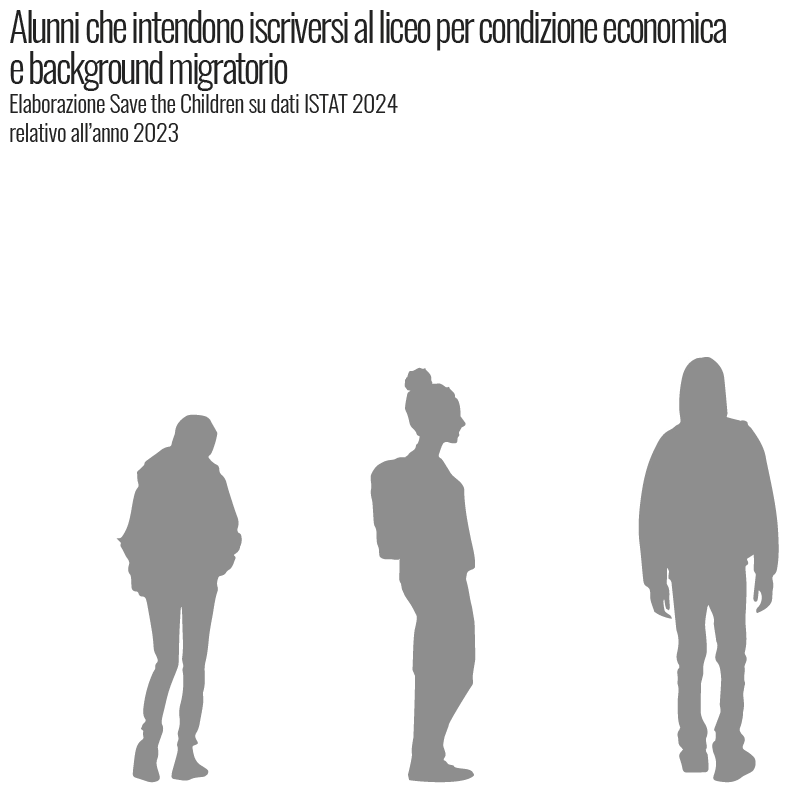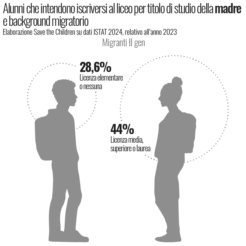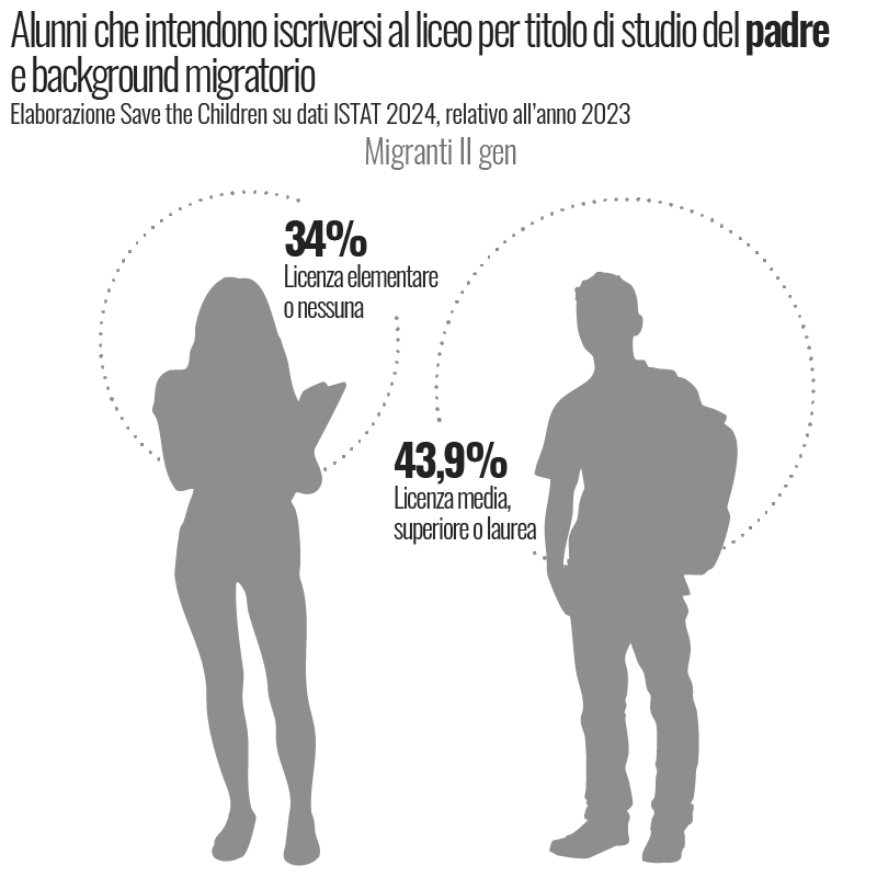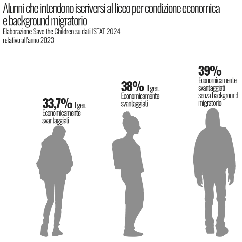 C’è però un segnale positivo: tra il 2022-2023 e il 2023-2024, la percentuale di studenti migranti di prima generazione provenienti da famiglie svantaggiate iscritti al liceo è cresciuta di 8 punti percentuali, un aumento molto più forte rispetto a quello degli studenti di seconda generazione (+3 punti percentuali).