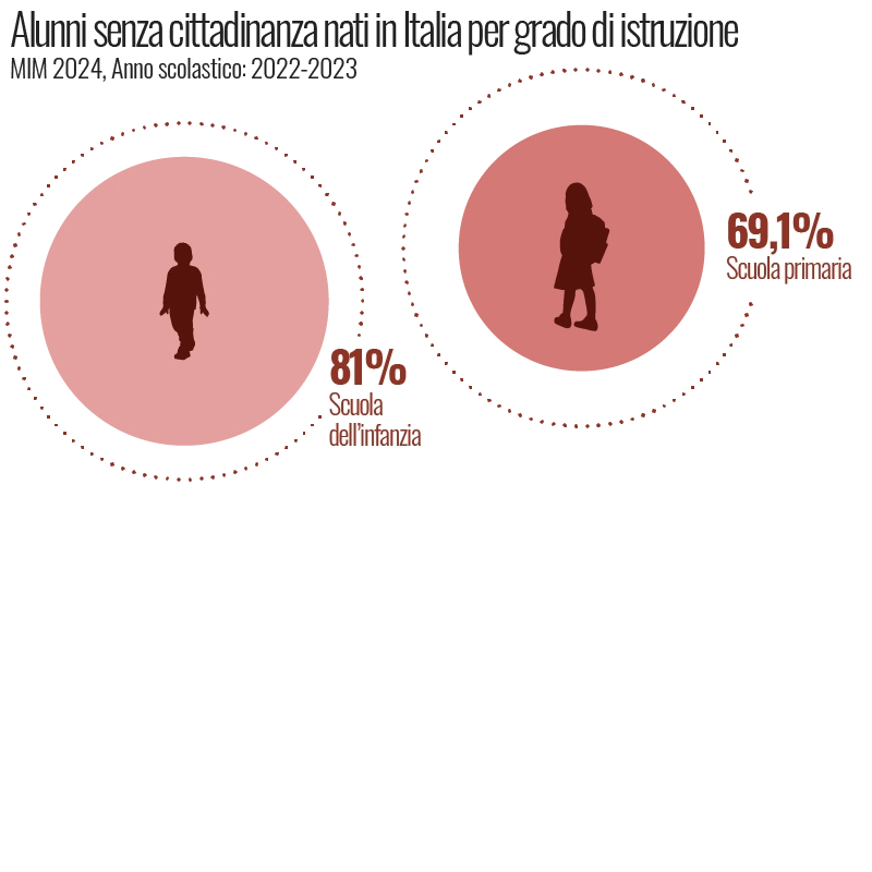Complessivamente, più di 3 alunni su 5 (il 65,4%) senza cittadinanza italiana sono nati nel nostro Paese, con valori che superano i 4 su 5 (81%) nella scuola dell’infanzia.