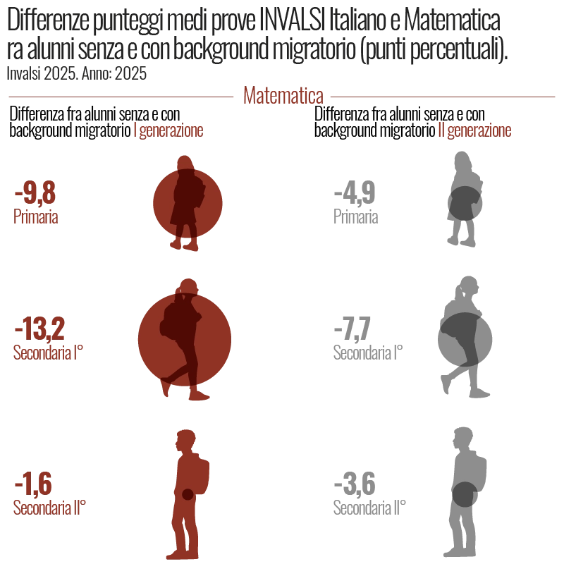 in italiano e di 9,8 punti percentuali in matematica rispetto agli studenti senza background migratorio. Il